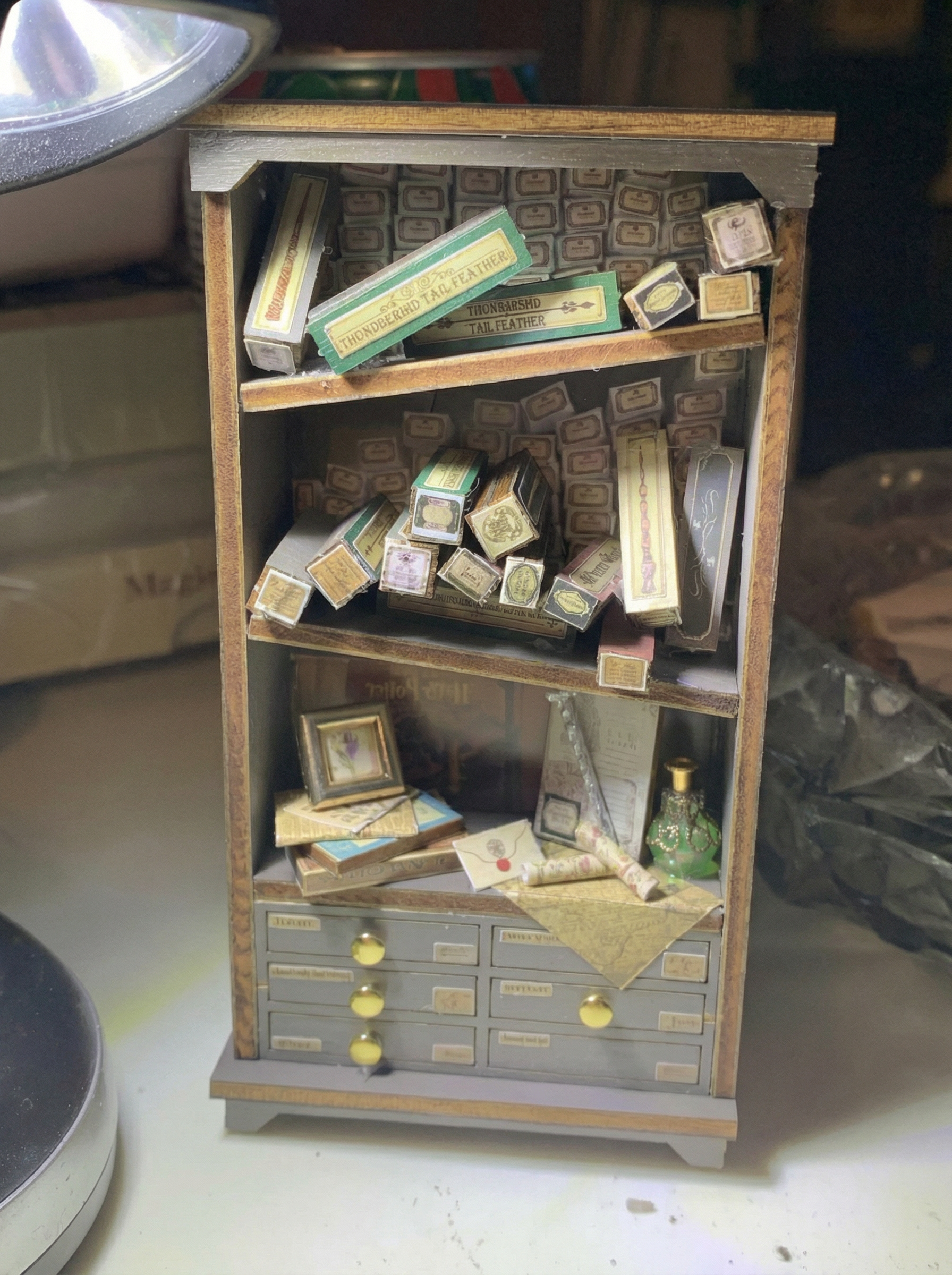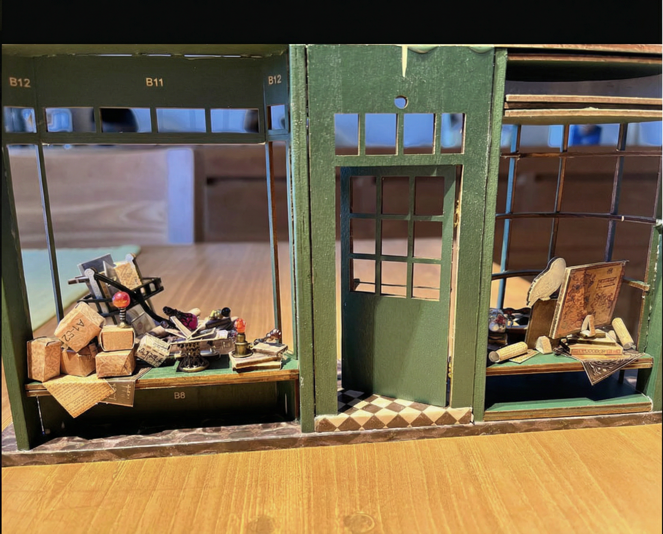 I craft every booknook alone in my workshop in England. I cut every panel, sand every edge, and place each tiny detail by hand. No factory, no assembly line, just me, my tools, and the quiet glow of the workshop. Each book nook takes days to build. I won’t send out anything I wouldn’t proudly keep on my own shelf.
